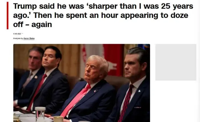美国有线电视新闻网(CNN)注意到,当美国商务部长卢特尼克谈及贸易战时,特朗普“似乎难以睁开眼睛”。在美国教育部长麦克马洪和美国卫生与公众服务部长小罗伯特·肯尼迪发言时,特朗普“似乎僵住了,闭着眼睛,每次持续10到15秒,然后才转动眼球或点头”。
